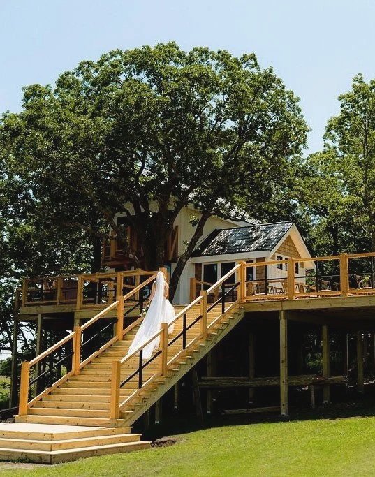 TreeHouse Heaven, a new unique wedding venue in Battle Lake, MN. Imagine exchanging vows on soaring treehouse decks, connected by 100ft of picturesque bridges, all nestled among majestic oak trees. Their multi-acre property features breathtaking outdoor spaces, perfect for a wedding or reception.